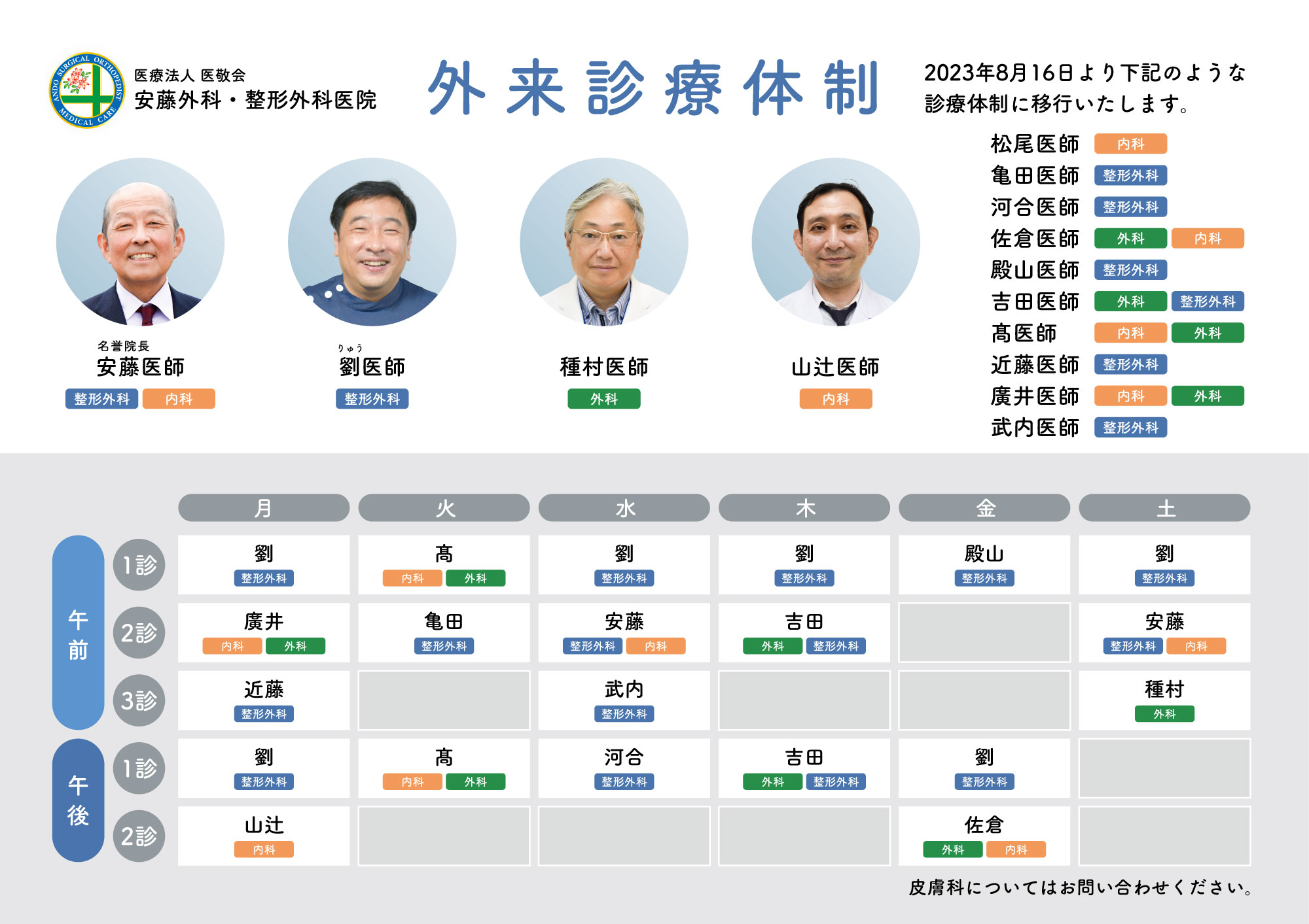 2023年8月16日(水)より、新たに整形外科医師 劉 納新先生が着任いたします。 外来診療体制が下記のとおり変更となりますのでお知らせいたします。