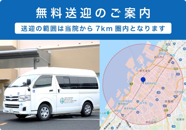 専属の送迎担当スタッフが親切丁寧な対応を心掛けて毎日送迎しています。午前診・午後診ともにご自宅から当院、当院からご自宅への送迎をしており、送迎の範囲は当院から7km圏内と、ほとんどの患者様のご自宅をカバーしております。